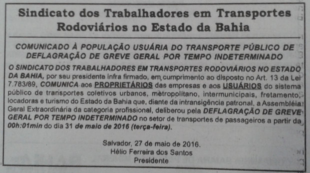 “Todo o rito jurídico está cumprido, toda a documentação foi feita. Se não tiver consenso, a greve se instala a partir de 0h de terça-feira (31) em todo o estado da Bahia, isso entre (os funcionários do sistema de transporte) urbano, intermunicipal, metropolitano, fretamento, locadora e turismo”, listou Hélio Ferreira, presidente do sindicato. A estimativa é que a categoria contempla 22 mil rodoviários no estado, 12 mil apenas em Salvador.